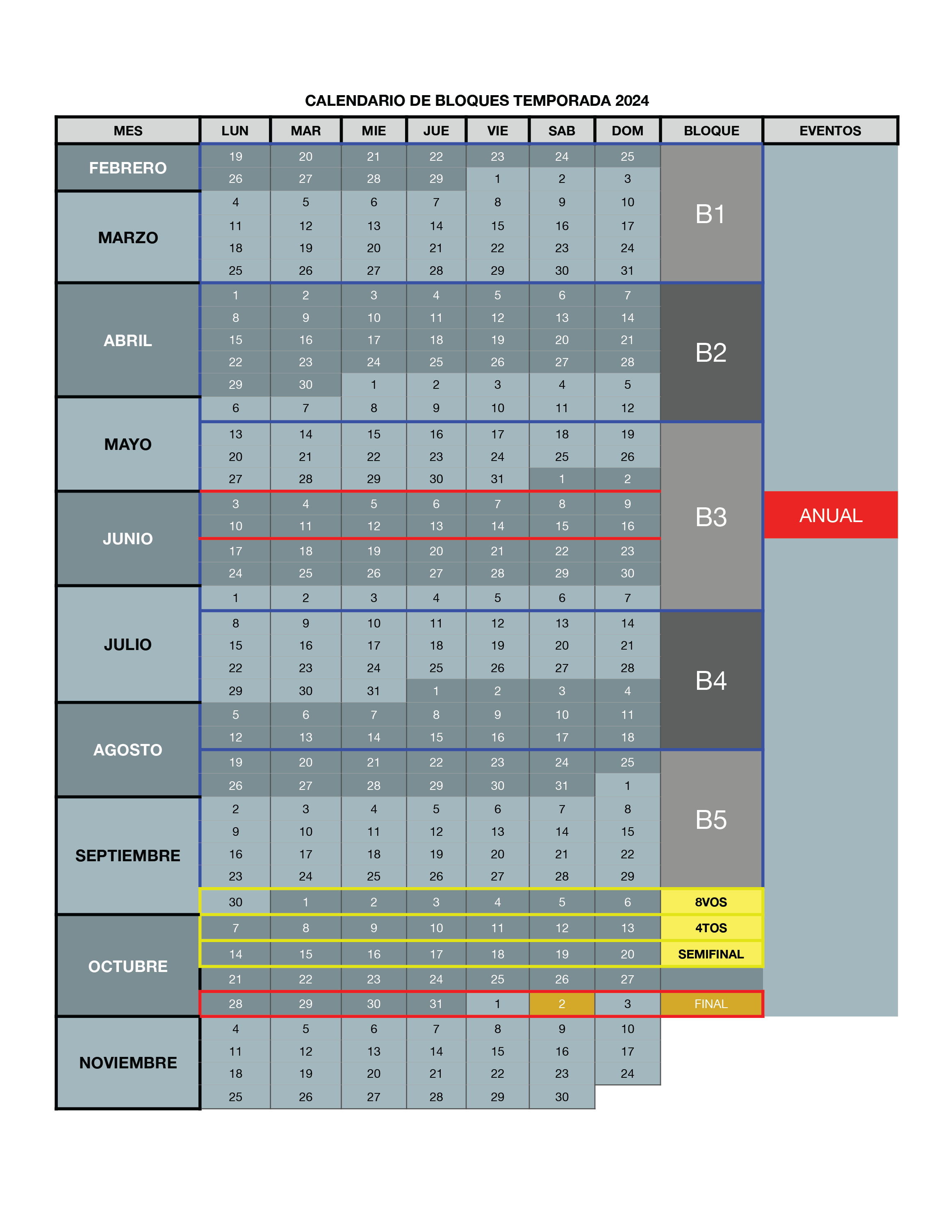 CALENDARIO EN ESTA SECCIÓN PUEDES ENCONTRAR LAS FECHAS Y DURACIÓN DE CADA BLOQUE, ASÍ COMO 8VOS Y 4TOS DE FINAL, SEMIFINAL Y FINAL DE TEMPORADA.